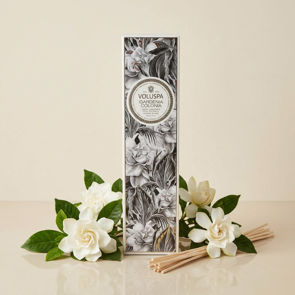 Transform your home into a haven of elegance with the Voluspa Maison Blanc Gardenia Colonia Reed Diffuser from Pleasant Beach Living. This exquisite diffuser combines a modern aesthetic with a vintage touch, creating a captivating centerpiece in any room.
